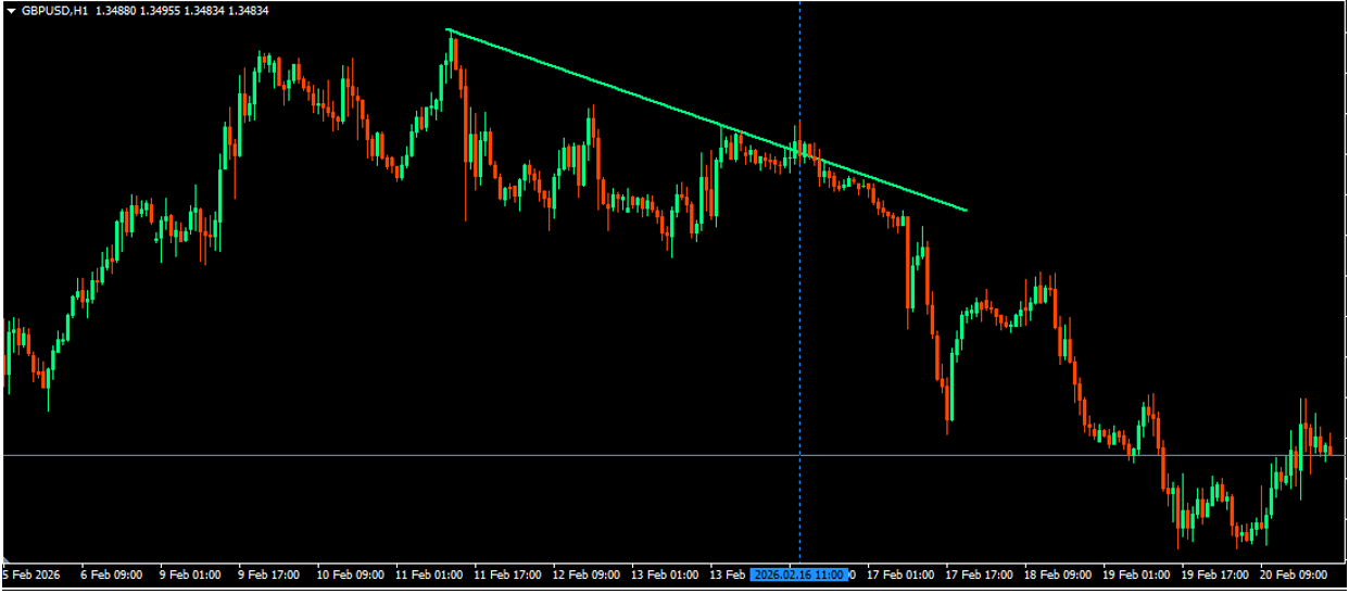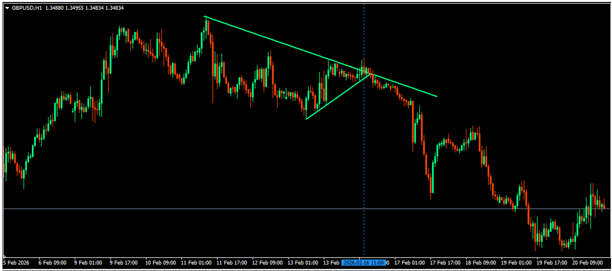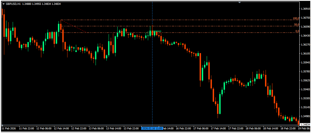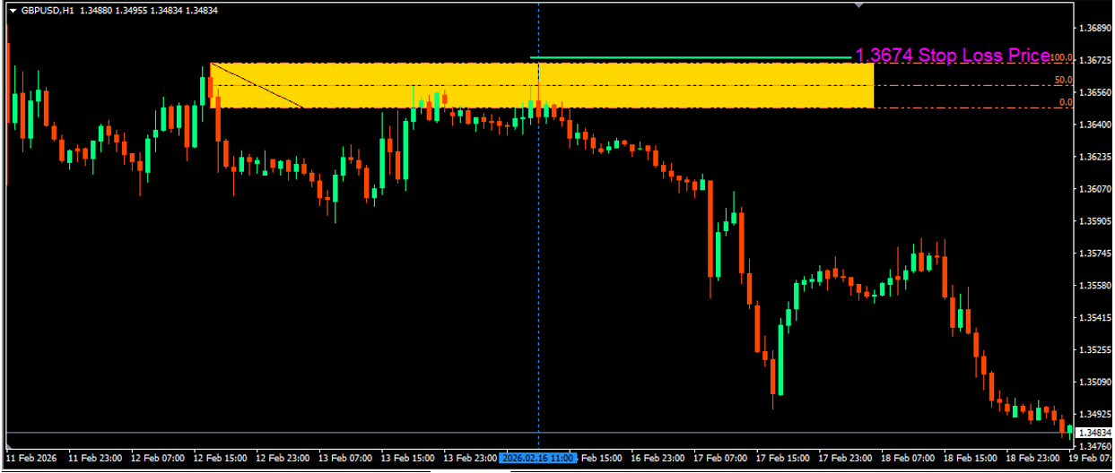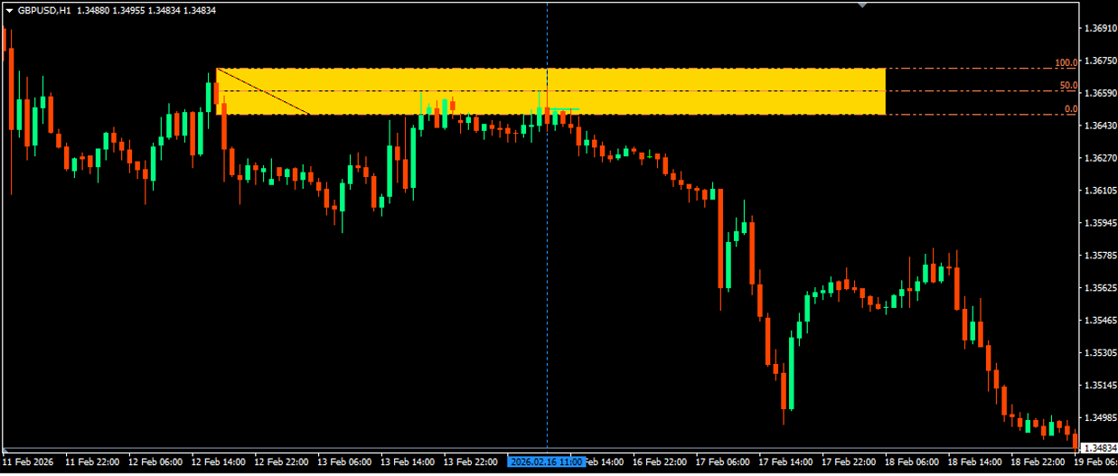 1. GBPUSD Signal date and time (16/02/2026, and Time 9:00am GMT, which falls on 11am on the chart for this broker [GMT+2]; indicated by the vertical blue line.