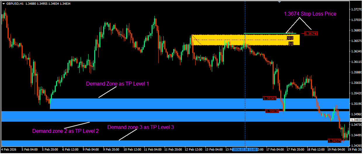 4. We enter a SELL trade here, then place our SL a couple of pips behind the Supply zone. In this case, that was @ 1.3674.