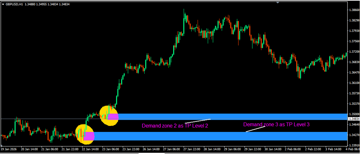 5. We use the Demand zones for our Take Profit (TP) price levels as shown for the Demand/Supply zones entry method.
