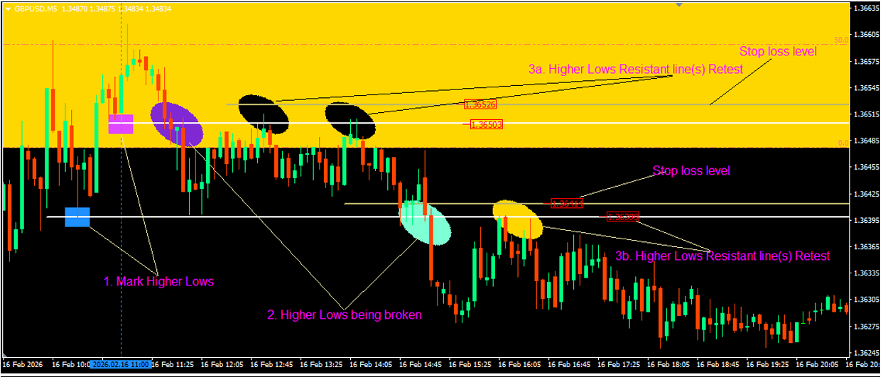 2. We drop the timeframe to the 5-minute timeframe (5m tf!) to time our entry. In this example, we marked the significant Higher Low(s) [on the 5m timeframe] before the signal time and waited for it to be broken. Once broken, the then Support line has now become a Resistant line.