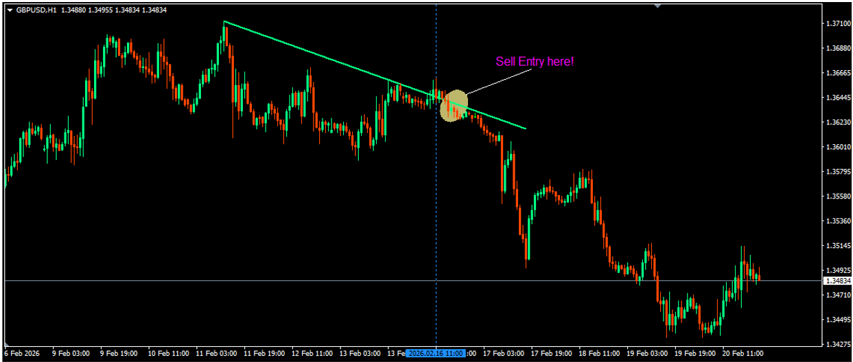 3. We now wait for the dynamic trendline to be broken over, then wait for the market price to drop and close under the trendline to then enter the SELL trade. *In this case, right about the signal time the dynamic trendline was broken over.